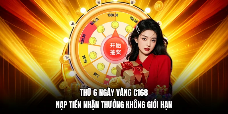 Thứ 6 ngày vàng C168 là chương trình khuyến mãi hấp dẫn dành cho thành viên khi nạp tiền vào hệ thống. Với ưu đãi thưởng thêm giá trị nạp, người chơi có thể gia tăng vốn cược nhanh chóng và tận hưởng nhiều cơ hội chiến thắng hơn. Đặc biệt, kho thưởng của chương trình được thiết kế không giới hạn, mang lại trải nghiệm hấp dẫn cho người tham gia mỗi tuần.